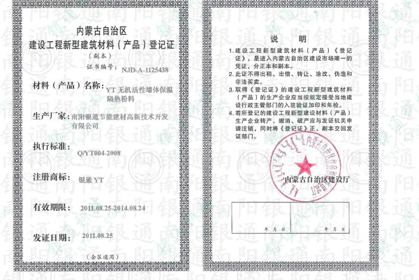 南陽銀通內(nèi)蒙古自治區(qū)建設(shè)工程新型建筑材料(產(chǎn)品)登記證