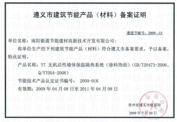 遵義市建筑節(jié)能產品(材料)備案證明