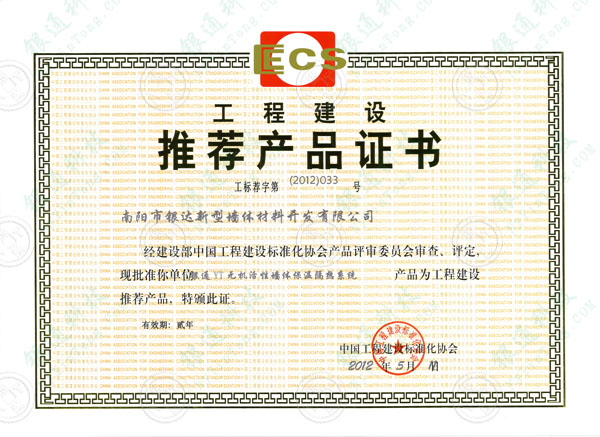 工程建設推薦產品證書 工標薦第(2012)032號 南陽銀通節能建材高新技術開發有限公司 經建設部中國工程建設標準化協會產品評審委員會審查、評定,現批準你單位銀通YT無機活性墻體保溫隔熱系統產品為工程建設推薦產品,特頒此證。有效期:貳年 中國工程建設標準化協會 2012年5月11日