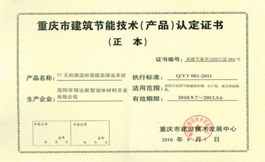 此證書為往年曾獲證書,本介紹頁僅為方便用戶了解企業歷史資質,望悉知 重慶市建筑節能基礎(產品)認定證書
