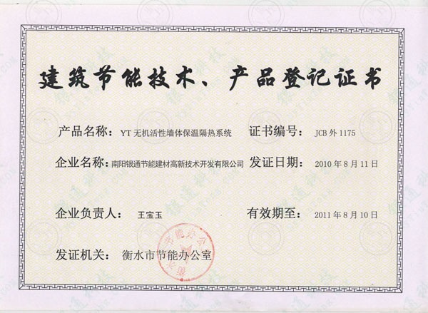 河北衡水市建筑節能技術產品登記證書 產品名稱 YT無機活性墻體保溫隔熱系統 證書編號JCB外1175 企業名稱南陽銀通節能建材高新技術開發有限公司發證日期2010年8月11日有效期至2011年8月10日發證機關衡水市節能辦公室