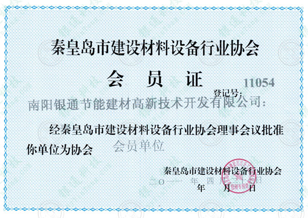 河北省秦皇島市建設(shè)材料設(shè)備行業(yè)協(xié)會會員證 登記號11054 南陽銀通節(jié)能建材高新技術(shù)開發(fā)有限公司 經(jīng)秦皇島市建設(shè)材料設(shè)備行業(yè)協(xié)會理事會會議批準(zhǔn)你單位為協(xié)會會員單位秦皇島市建設(shè)材料設(shè)備行業(yè)協(xié)會 2011年4月