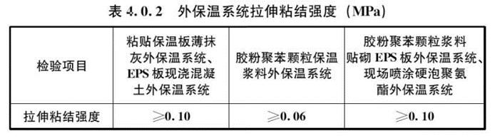 4.0.2 外保溫系統(tǒng)經(jīng)耐候性試驗后,不得出現(xiàn)空鼓、剝落或脫落、開裂等的破壞,不得產(chǎn)生裂縫出現(xiàn)滲水;外保溫系統(tǒng)拉伸粘結(jié)強度應(yīng)符合表4.0.2的規(guī)定,且破壞部位應(yīng)位于保溫層內(nèi)。