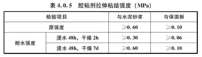 4.0.5 膠粘劑拉伸粘結(jié)強度應(yīng)符合表4.0.5的規(guī)定。膠粘劑與保溫板的粘結(jié)在原強度、浸水48h且干燥7d后的耐水強度條件下發(fā)生破壞時,破壞部位應(yīng)位于保溫板內(nèi)。