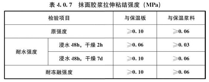 4.0.7 抹面膠漿拉伸粘結(jié)強度應(yīng)符合表4.0.7的規(guī)定。抹面膠漿與保溫材料的粘接在原強度、浸水48h且干燥7d后的耐水強度條件下發(fā)生破壞時,破壞部位應(yīng)位于保溫材料內(nèi)。