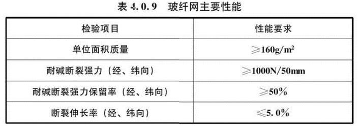 4.0.9 玻纖網(wǎng)的主要性能應(yīng)符合表4.0.9的規(guī)定。