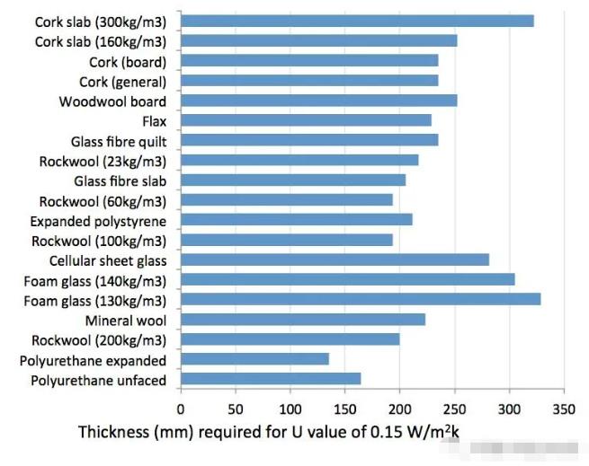 不同保溫材料在同等保溫傳熱系數目標下的厚度對比