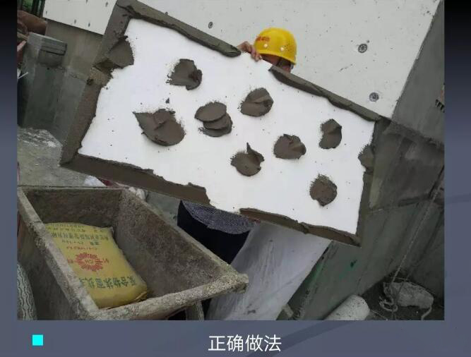 正確做法:玻纖網要夾在抹面層中間,即先把底面抹勻再掛玻纖網,再抹一邊砂漿。抹面層保護保溫層并起著防裂防水抗沖擊和一定防火作用。