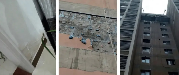 江蘇某項目,共3棟31層高層住宅和2棟3層別墅,外墻采用聚氨酯復合保溫板外墻外保溫系統,涂料飾面。該項目外保 溫構造如下:基層(含界面劑處理)+砂漿找平層+黏結砂漿+聚氨 酯復合保溫板+抗裂砂漿(壓入耐堿玻纖網格布)+外墻膩子+涂 料飾面。小區投入使用后陸續發現局部外飾面位置出現裂縫、起鼓脫殼情況,隨后開裂情況加劇,出現滲漏,局部出現脫落的情況。
