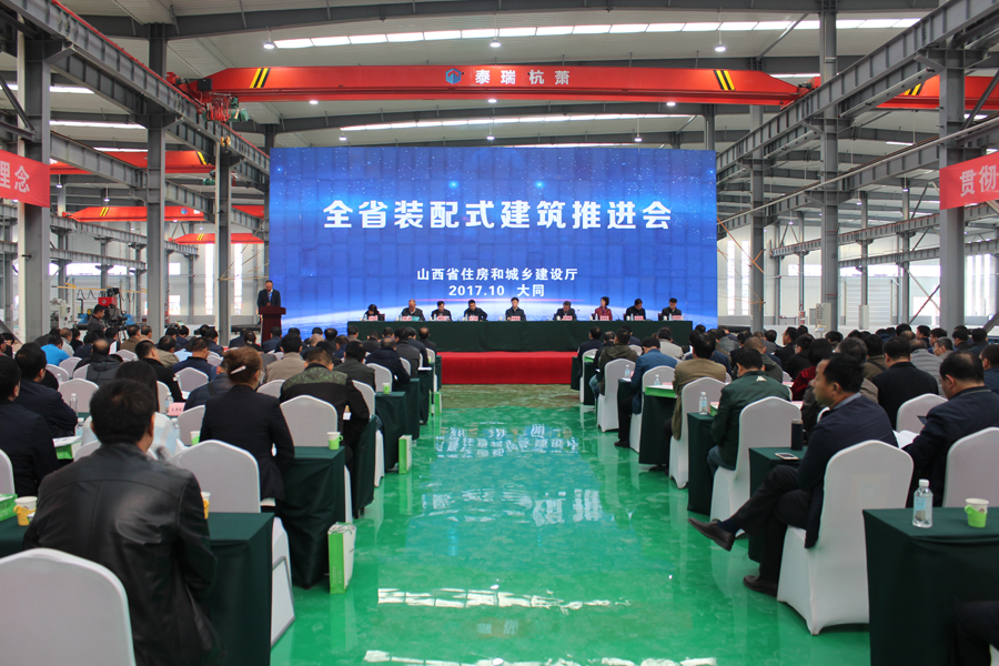 參會人員現場觀摩了大同泰瑞裝配式建筑示范項目和產業基地建設情況,之后在裝配式建筑生產線車間現場召開了推進會。會議通報了省住房城鄉建設廳出臺的《裝配式建筑行動方案》,太原、大同兩市住房城鄉建設主管部門和山西建投、大同泰瑞匯報了工作推進情況。