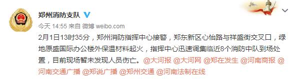 2月1日13時(shí)35分,鄭州消防指揮中心接警,鄭東新區(qū)心怡路與祥盛街交叉口,綠地原盛國(guó)際辦公樓外保溫材料起火,指揮中心迅速調(diào)集臨近8個(gè)消防中隊(duì)到場(chǎng)處置,目前現(xiàn)場(chǎng)暫未發(fā)現(xiàn)人員傷亡。
