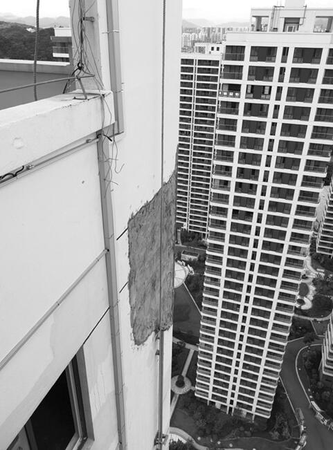 今年7月,小區(qū)陸續(xù)交付。王先生在小區(qū)內(nèi)查看時卻發(fā)現(xiàn)部分外墻有修補(bǔ)痕跡,“有些地方甚至還在脫落。”到了8月份,受臺風(fēng)及接連的雨水天氣影響,墻面脫落問題愈加嚴(yán)重。“成塊成塊地掉落,大片外墻都裸露著,面積大的有好幾個平方米,地面上都是外墻掉落的碎石塊。”王先生說,墻皮厚度約1厘米,從高處掉落萬一砸到人,后果不堪設(shè)想,“小區(qū)陸續(xù)交付,很多業(yè)主已在裝修,小區(qū)里每天都有人出入,這種‘定時炸彈’一樣的墻體怎么能讓人放心?”