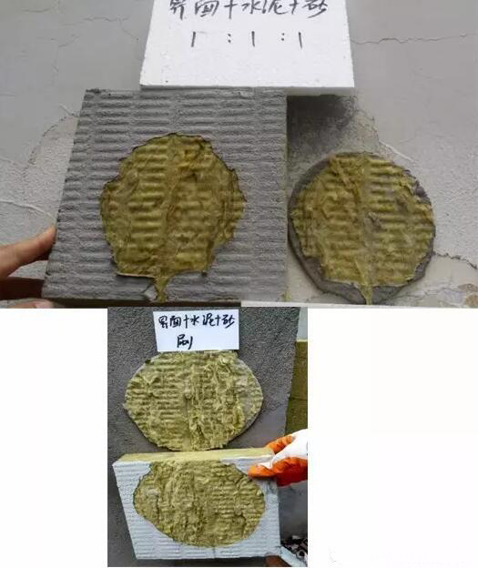 專業人員曾做過一組對比試驗,在墻上粘貼4組巖棉板,包括未涂刷界面劑的、涂覆乳液狀界面劑的、涂覆按照乳液:水泥=1:1界面劑的、涂覆乳液:水泥:混合砂=1:1:1界面砂漿。