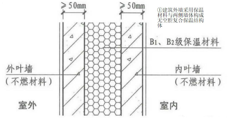 ①是最特殊的,現(xiàn)在應用較少的一種情況,保溫材料夾在墻體中間,墻體既有支撐作用又有防護作用要求墻體厚度不小于50mm。采用B1、B2級材料時用A級材料在樓板處進行隔離,高度不小于300mm,防止下一層著火,延保溫層豎向蔓延。就想前面提到的火災一樣。