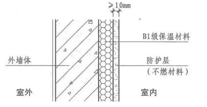 建筑內保溫人密(人多,發(fā)生火災不利于疏散),用火油氣(火災危險性大的場所),疏散通道(著火了要從這些地方跑或避難)采用A級;其他B1級并且因為是室內如果產生有毒煙氣會造成人員傷亡要求低煙低毒。下圖為內保溫采用B1級材料時,防護層設置示意圖。