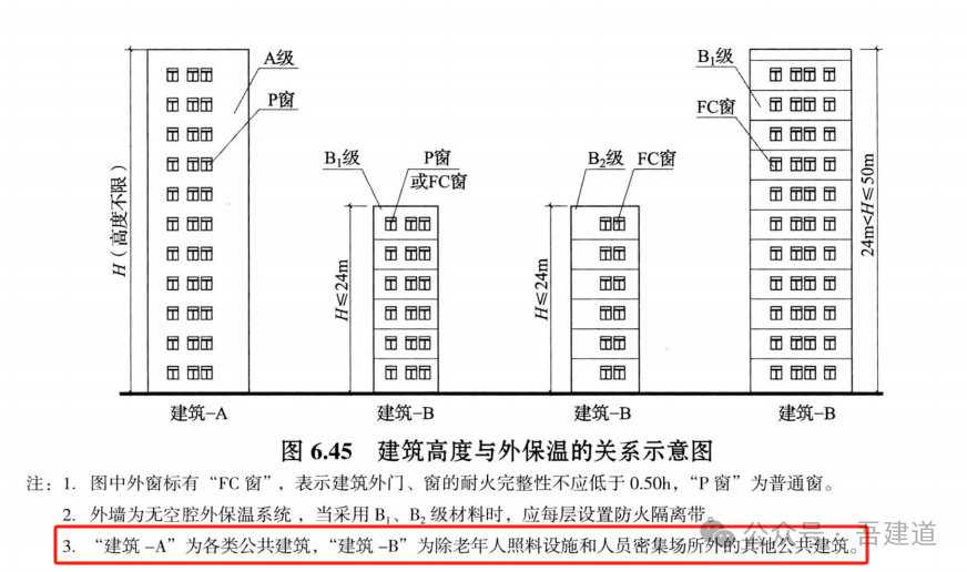 4、《《建筑設計防火規范》GB50016-2014(2018年版)實施指南》對此也有闡述:除設置人員密集場所的建筑和部分設置老年人照料設置的建筑外,其他工業與民用建筑外墻外保溫系統中保溫材料的燃燒性能要求,根據其建筑高度是否大于24m、50m而有所區別。不同建筑高度各類工業與民用建筑外窗的耐火性能與保溫材料的燃燒性能的關系參見圖6.45;(★備注:圖6.45中表述的建筑類型僅明確公共建筑,與正文中的“各類工業與民用建筑”表述不一致);