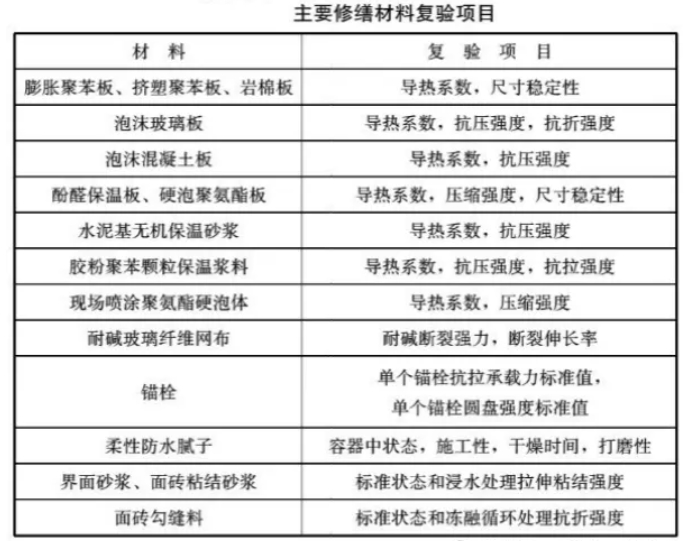 進(jìn)場(chǎng)驗(yàn)收+監(jiān)理見證取樣復(fù)驗(yàn)(修復(fù)面積合計(jì)≥1000㎡時(shí))+外墻外保溫粘貼拉拔試驗(yàn)(修復(fù)面積合計(jì)≥1000㎡時(shí))+紅外熱工缺陷檢測(cè)
