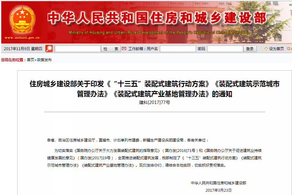 2017年3月,住建部發布《“十三五”裝配式建筑行動方案》,方案要求全面推進裝配式建筑發展,到2020年,全國裝配式建筑占新建建筑的比例達到15%以上,培育50個以上裝配式建筑示范城市、200個以上裝配式建筑產業基地、500個以上裝配式建筑示范工程,建設30個以上裝配式建筑科技創新基地。