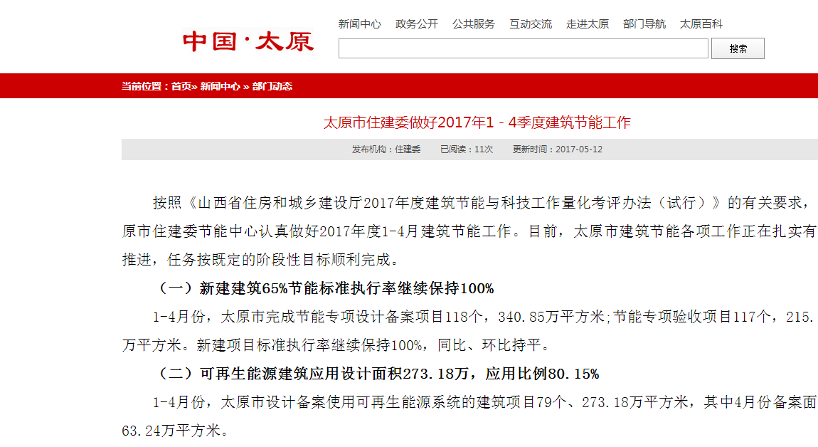 按照《山西省住房和城鄉建設廳2017年度建筑節能與科技工作量化考評辦法(試行)》的有關要求,太原市住建委節能中心認真做好2017年度1-4月建筑節能工作。目前,太原市建筑節能各項工作正在扎實有序推進,任務按既定的階段性目標順利完成。